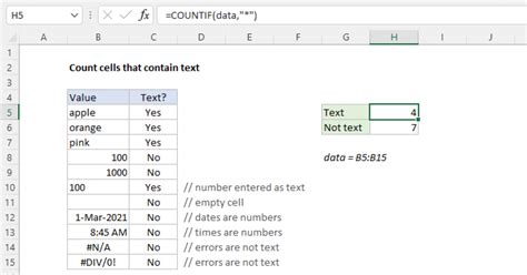 Web in excel, you can use the countif function to count either cells containing any text or cells containing.
