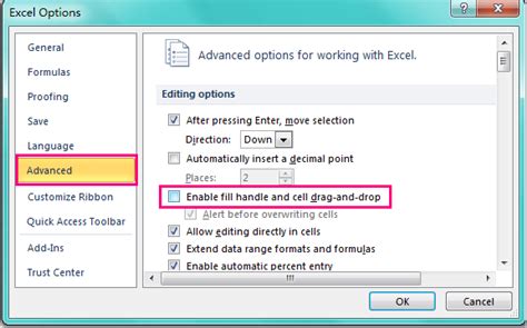 Web using the excel options panel, select advanced. In the editing options section, uncheck enable fill handle and cell drag.