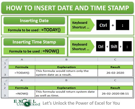 Web what’s a timestamp. These methods include both static and dynamic methods. Web select the cell where you want to insert the timestamp. Use the keyboard shortcut control + : Inserting date and timestamp using keyboard shortcuts (static method). Using now function to insert timestamp. Formula to insert today date & current time as unchangeable time stamp. The now function returns date and time with format mm/dd/yyyy hh: Web there are multiple ways to insert date and timestamp in excel. Web shortcuts to show today's date and current time (time stamp) functions to insert today's date that updates automatically.