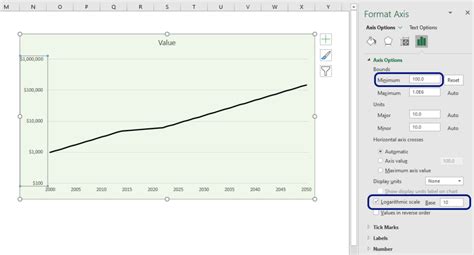 Web to tell excel to use logarithmic scaling of the value (y) axis, simply select the logarithmic scale check.