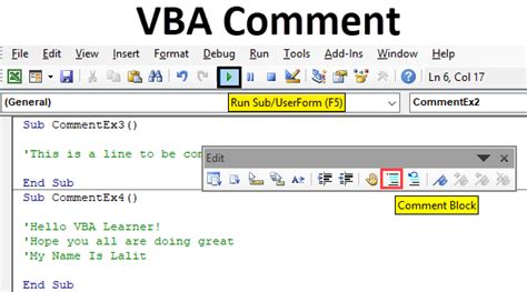 Under categories click on edit, then select comment block in the commands. Under categories click on edit, then select comment block in the commands. Place your cursor at the very beginning of the line you wish to comment type an apostrophe symbol either click off the line. Web steps to insert a vba comment: Web use comments ( index ), where index is the comment number, to return a single comment from the comments collection. Web in excel vba, there are several ways to comment lines of a code: If not, right click a toolbar in the vbe and choose customize. Web yes and it's called comment block and, it may not be present on your toolbar. Single quotation (‘) comment block button in the toolbar adding the rem keyword.