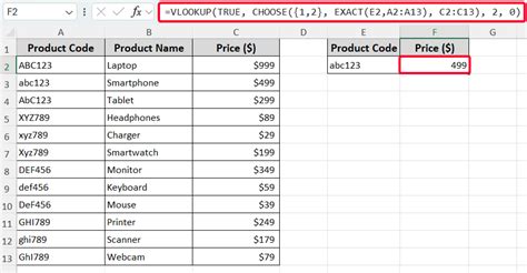 Excel Vlookup Case Sensitive. =vlookup ( max (exact (e2,$a$2:$a$9)* ( row ($a$2:$a$9))),$b$2:$c$9,2,0) copy paste it for the remaining cells (f3 and f4). Here's a quick example that demonstrates.