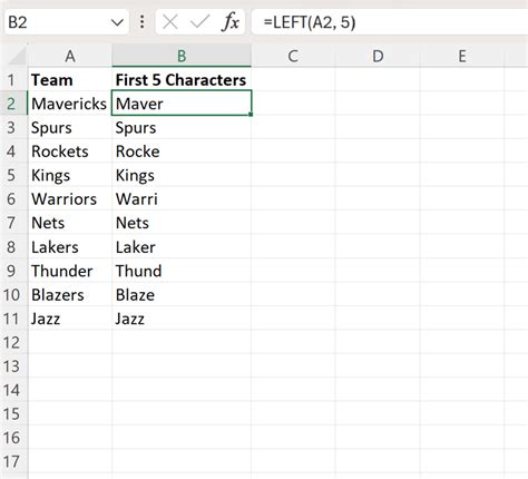 First 5 Characters Excel. Leftb counts 2 bytes per. Web select a blank cell, here i select the cell g1, and type this formula =left (e1,3) (e1 is the cell you want to extract the first 3 characters from), press enter button, and drag fill handle to the range you want.