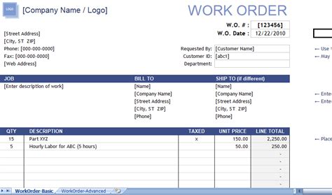 Excel Work Order Template Free Addictionary