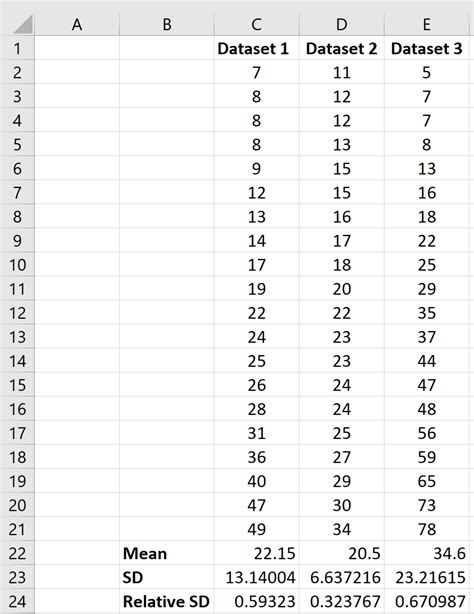 Web this wikihow teaches you how to find the relative standard deviation (rsd) of a range in microsoft excel. Web this wikihow teaches you how to find the relative standard deviation (rsd) of a range in microsoft excel. Relative standard deviation = s / x * 100%. This metric gives us an idea of how closely observations are clustered around the mean. Web the relative standard deviation is a measure of the sample standard deviation relative to the sample mean for a given dataset. Rsd (relative standard deviation)=s×100 / x¯. The formula you’ll need to use is = (stdev (range)/average (range))*100. Web relative standard deviation, also known as coefficient of variation, is a statistical measure that expresses the standard deviation of a set of values as a percentage of the mean. X¯ = mean of the data. Where, rsd = relative standard deviation. Web relative standard deviation = s / x * 100%.